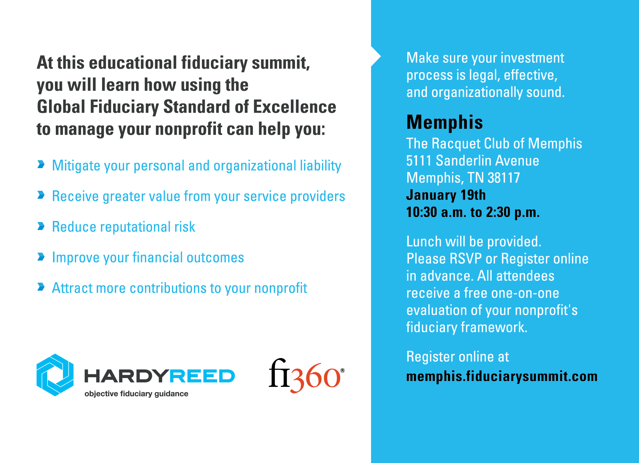 Hardy Reed is co-hosting with fi360 a Nonprofit Fiduciary Summit in Memphis, TN on January 19th and Jackson, MS on January 21st (the details are below). Our goal is to help Non-profits better understand and manage fiduciary best practices based on The Global Fiduciary Standard of Excellence.